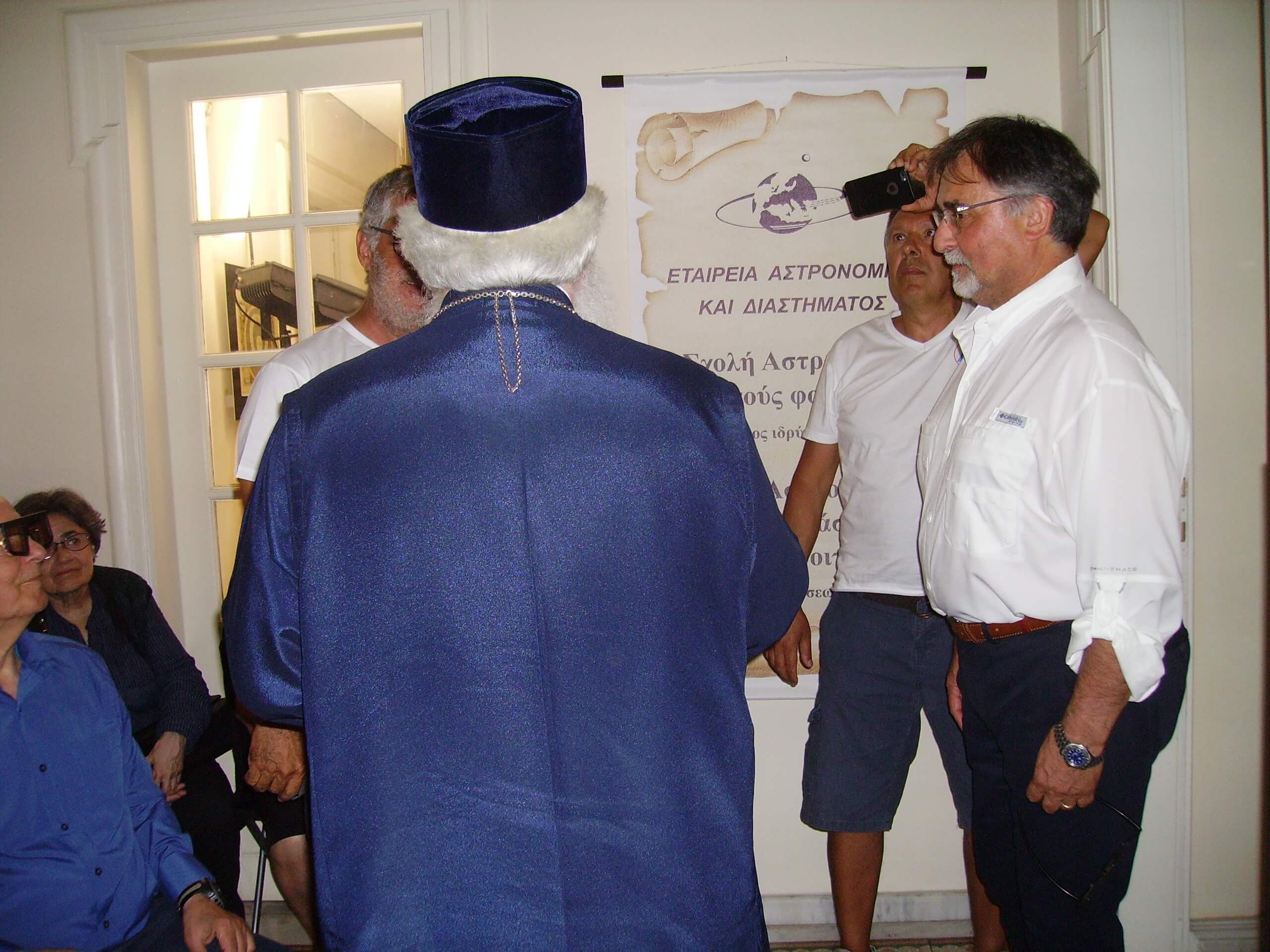 Ο Σεβασμιότατος παρακολουθεί το βίντεο με στερεοσκοπικά γυαλιά, που προβάλλεται, συνεχώς και έχει ως θέμα την αρχαία ελληνιστική Αλεξάνδρεια