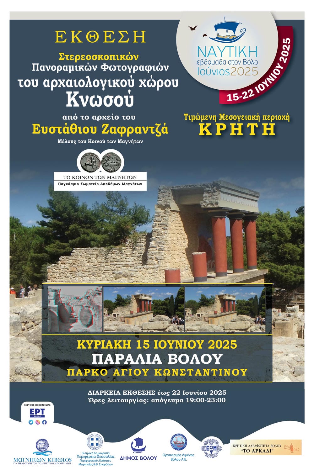Στο πλαίσιο  των εκδηλώσεων της Ναυτικής Εβδομάδος 2025 στο Βόλο, με τιμώμενη πόλη την ΚΡΗΤΗτο Κοινόν των Μαγνητών,  Παγκόσμιο Σωματείο Αποδήμων Μαγνήτων,  συμμετέχει με  Έκθεση σπάνιων  στερεοσκοπικών Φωτογραφιών του  αρχαιολογικού χώρου του ανακτόρου της  Κνωσού και  του  αρχαιολογικού μουσείου Ηρακλείου, οι οποίες έχουν ληφθεί από τον κ. Ευστάθιο Ζαφραντζά, μέλος του Κοινού των Μαγνήτων  τα περασμένα χρόνια. Βλέπε συν.  σχετική αφίσα.